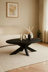 The Salontafel Lotte is an oval coffee table in mango wood with a black finish, featuring a sandblasted surface a refined Swiss edge. Supported by Matrix XS metal legs, it combines durability with a style, making it a versatile centerpiece for any elegant amd chic interior. Also available in multiple colours.