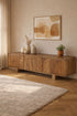 The TV Meubel Niva 160 is a mango wood TV cabinet in a warm brown finish, featuring 3 doors for generous storage. With its flat and smooth surface, it blends practical functionality with timeless design, making it a perfect centerpiece for modern design interiors.